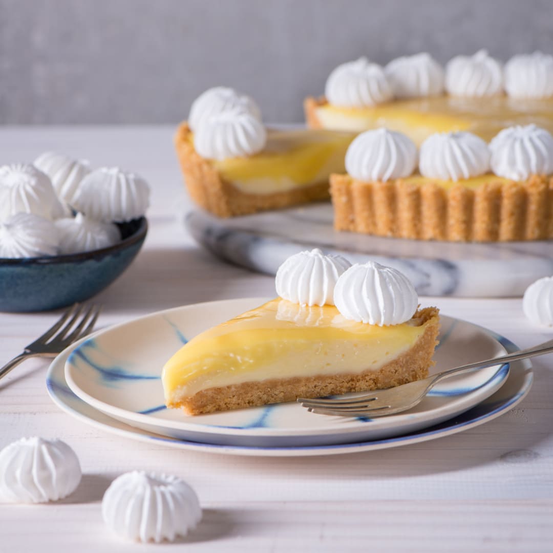 - To serve, remove the milk tart from the cake tin. Spread lemon curd and decorate with meringue kisses.