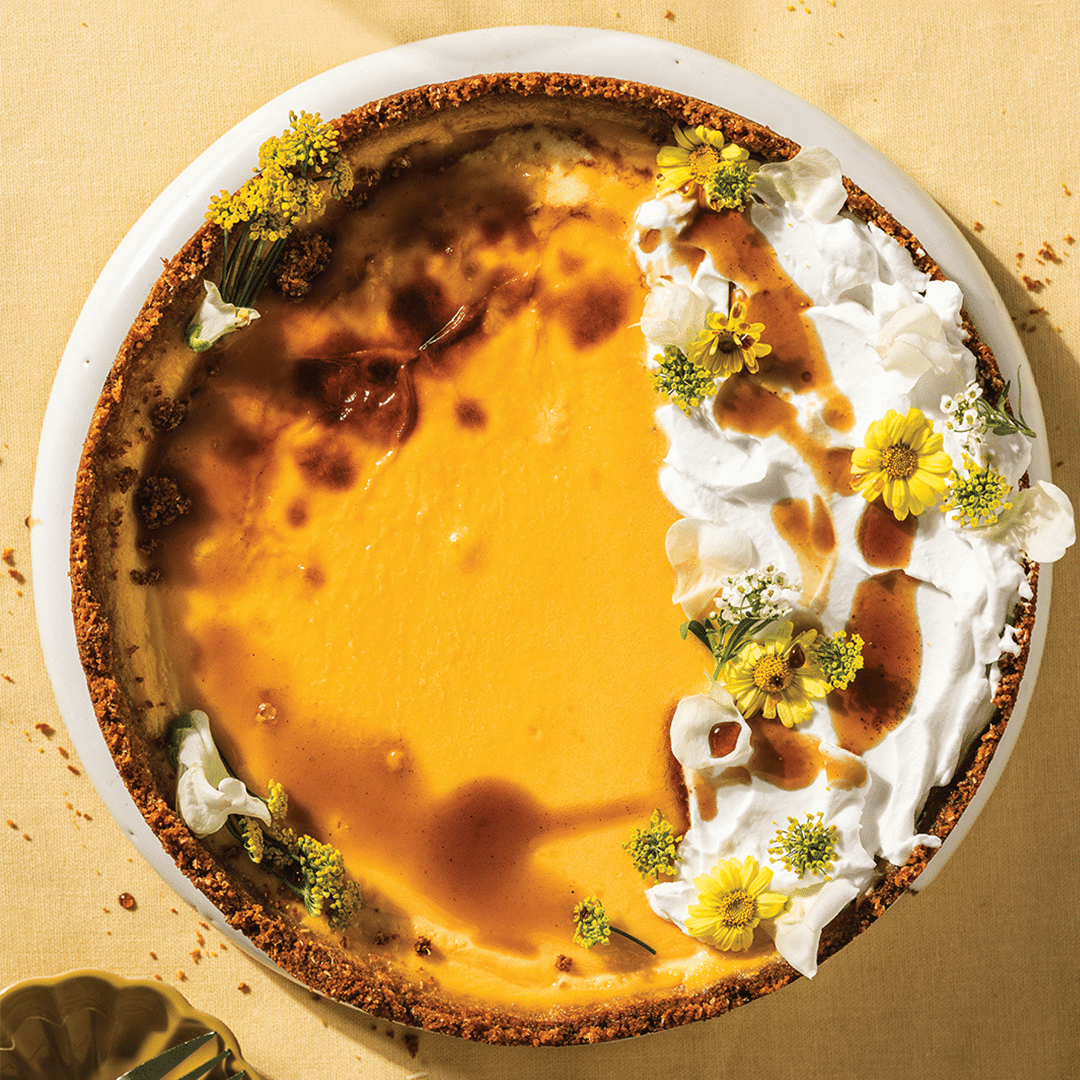- To serve, dollop cream onto the tart, drizzle with spiced syrup and decorate with edible flowers.
