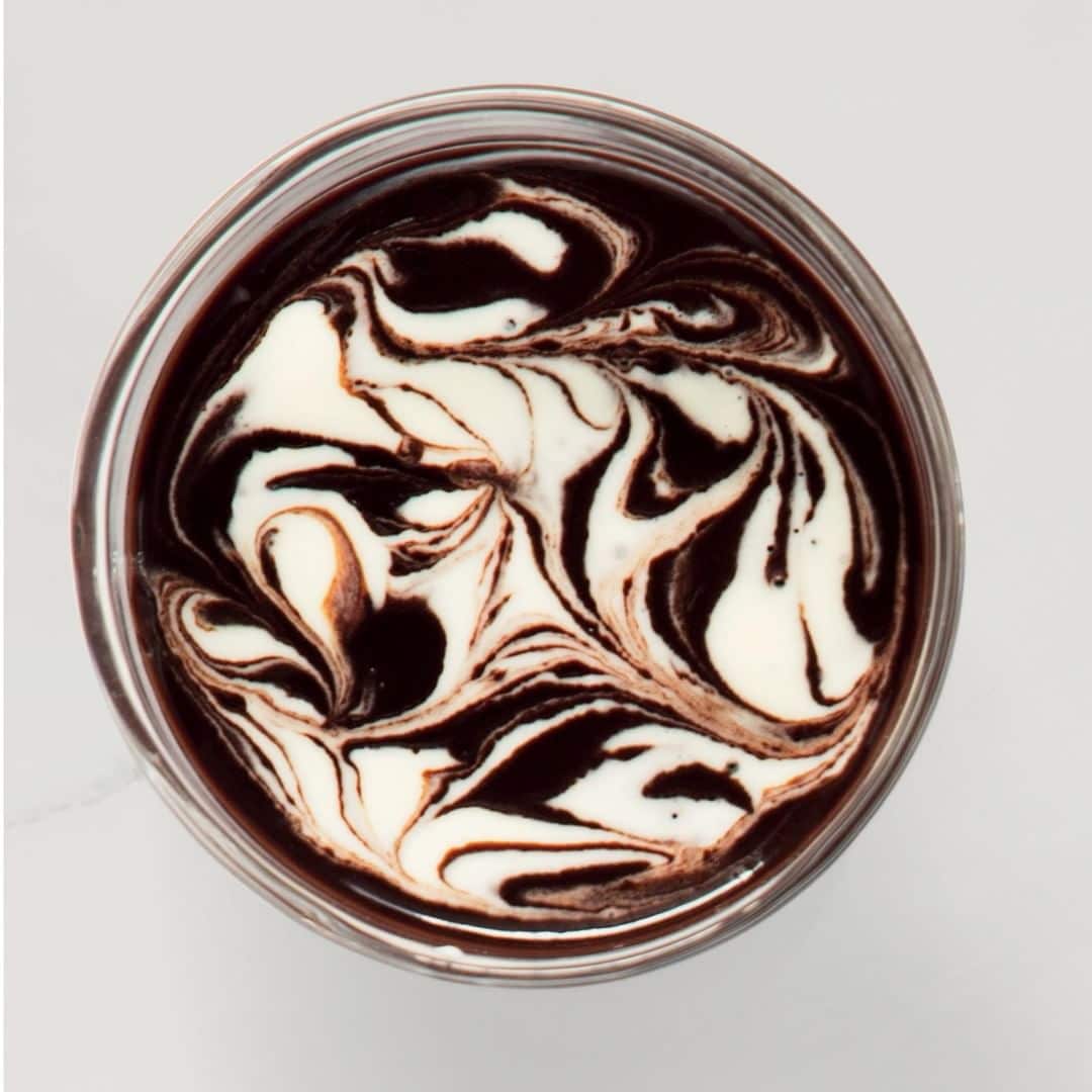 - Heat the condensed milk in the microwave for 1 minute. Slowly pour into the hot cocoa, creating a marbled effect. Serve without stirring.