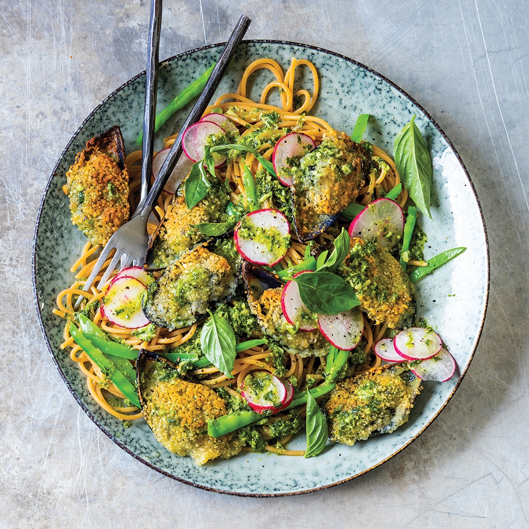 Garlicky basil & mussel pasta