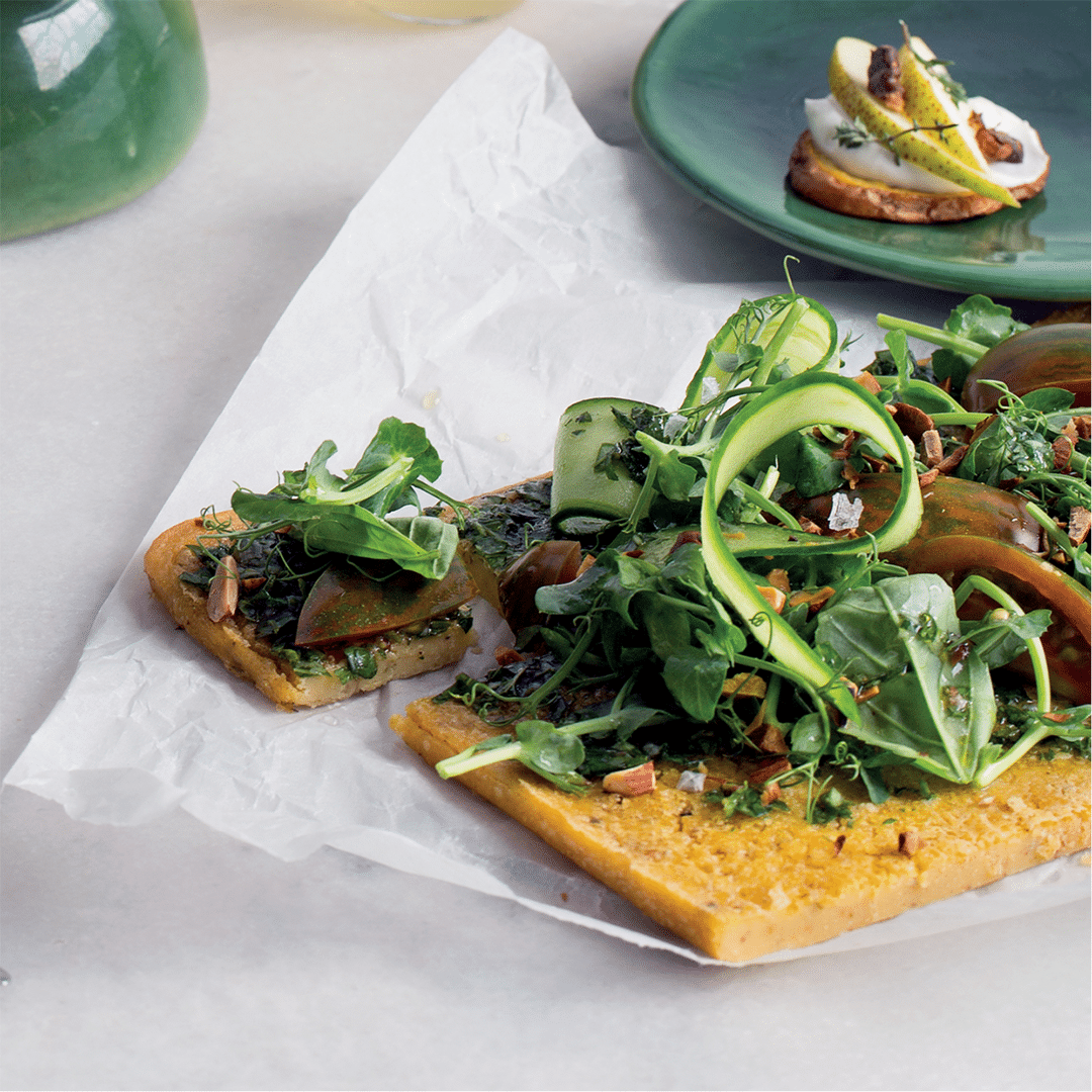 - To assemble, spoon the salsa onto the socca and garnish with cucumber ribbons. Cut into slices and eat immediately.