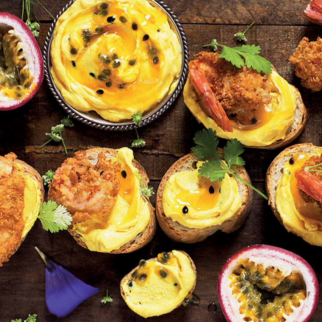 - To serve, spread a generous layer of granadilla cream cheese on each slice of bread, top with a tempura prawn and serve immediately.