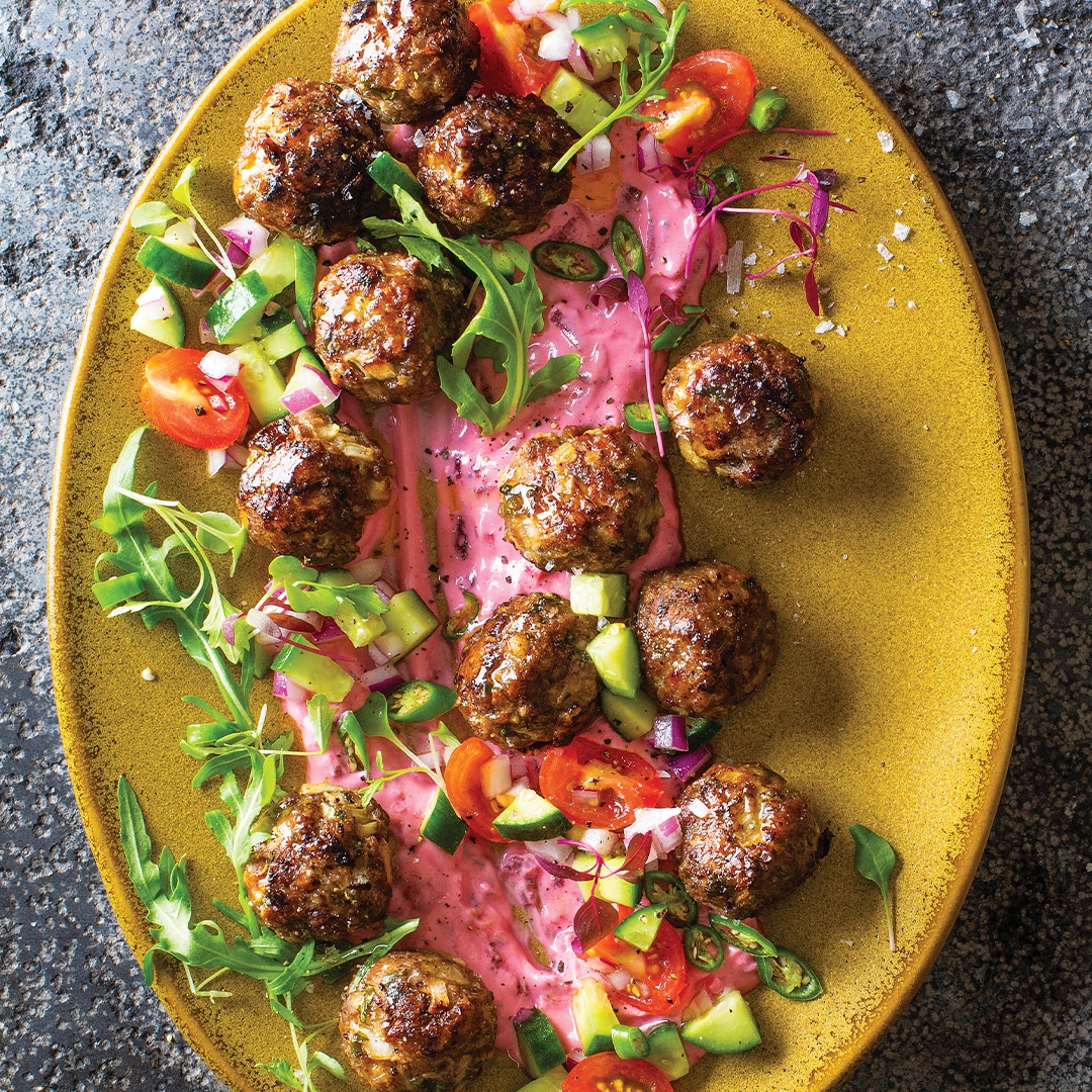 - To serve, spread raita over a platter and top with salad, rocket or micro herbs and frikkadels.