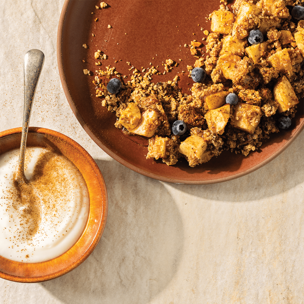 - Add remaining coconut oil to remaining crumble, rubbing together to form clumps. Place these on top of the apple pieces.