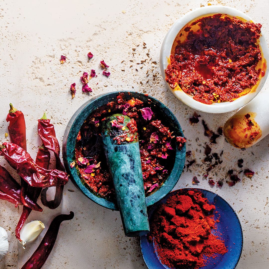 - Combine chillies, toasted spices, garlic, lemon juice, smoked paprika and oil in a jug.