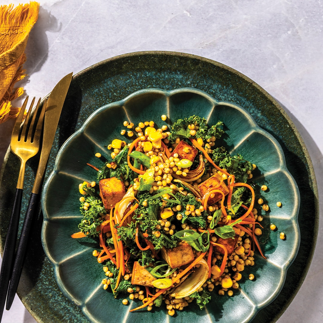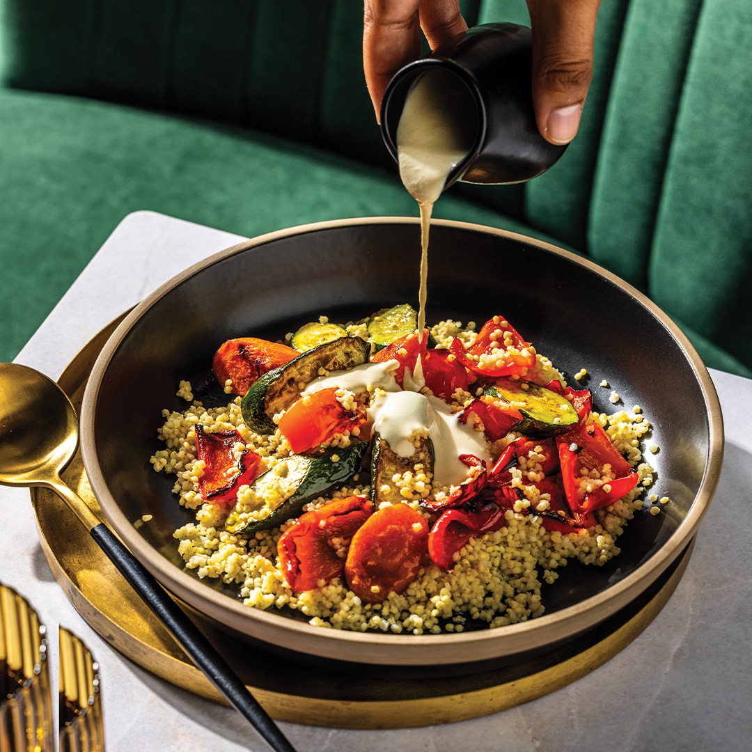 10. To assemble, combine fonio with the roasted vegetables, drizzle with dressing and toss to combine.