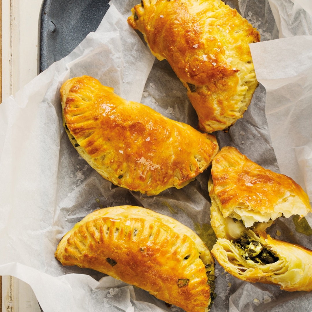 3. Mix the spinach with the feta and divide it between the pastry cases. Place the filling on one side and fold over to create a half-moon, pressing the edges down to seal. Freeze.