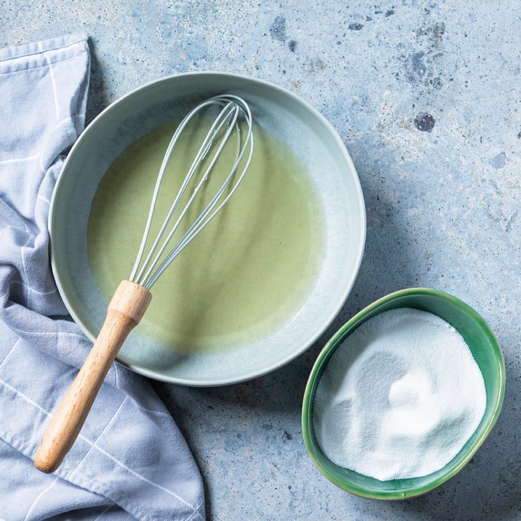 - Whip the aquafaba until stiff peaks form, adding the sugar gradually until the sugar has dissolved.