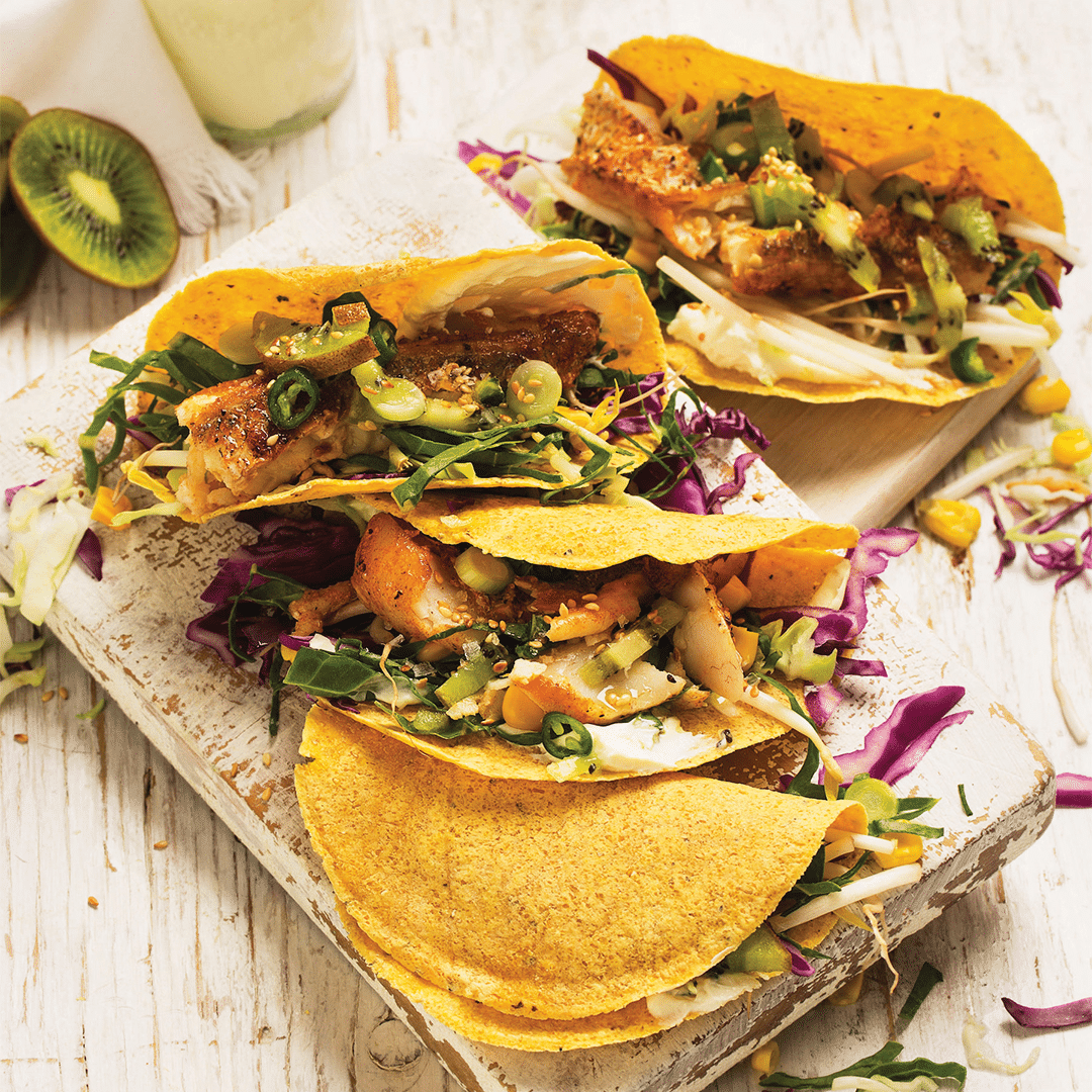 - Spread cottage cheese inside each taco and fill with a piece of hake, cabbage, spinach, corn and sprouts. Top with kiwi salsa and sesame seeds.