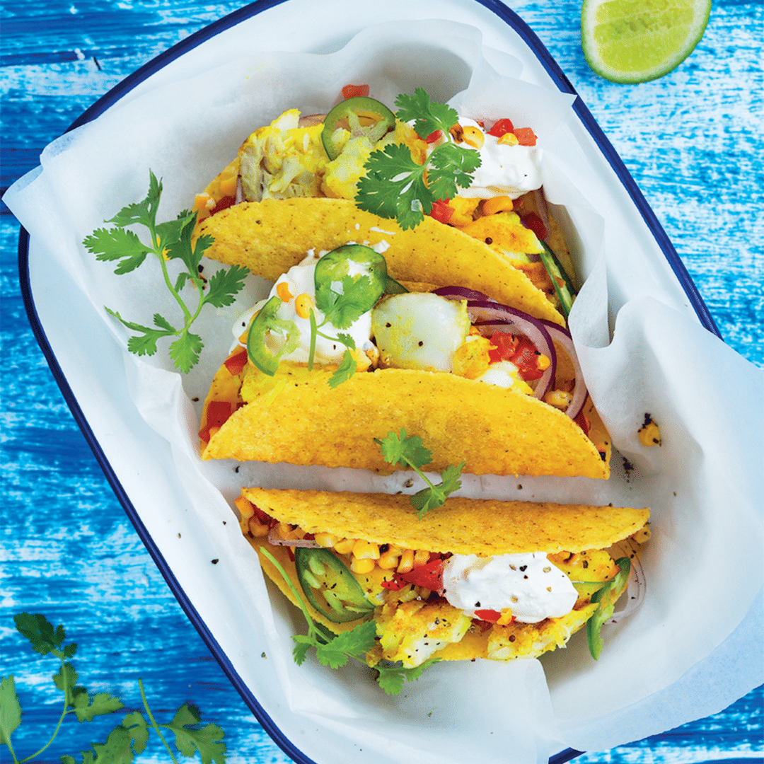 - For the hake tacos, preheat the oven grill. Line a baking tray.
