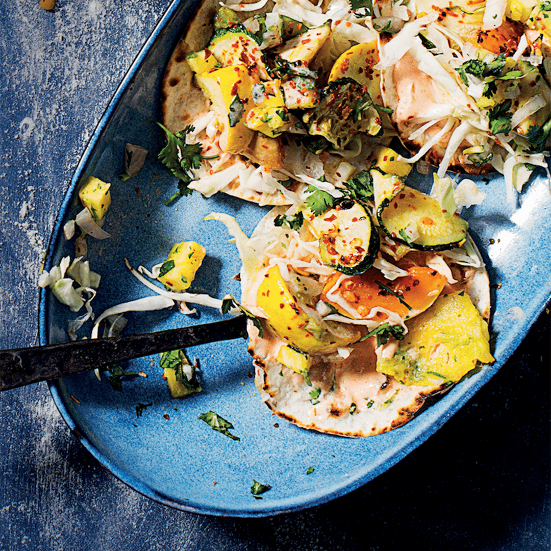 3 Rainbow squash tortillas with pineapple salsa and yoghurt sauce