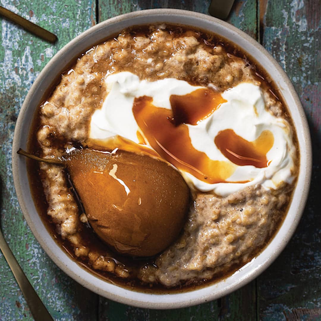- Spoon a generous serving of oats into a bowl. Top with a dollop of yoghurt and arrange a poached pear over the top. Drizzle over extra syrup and serve warm.