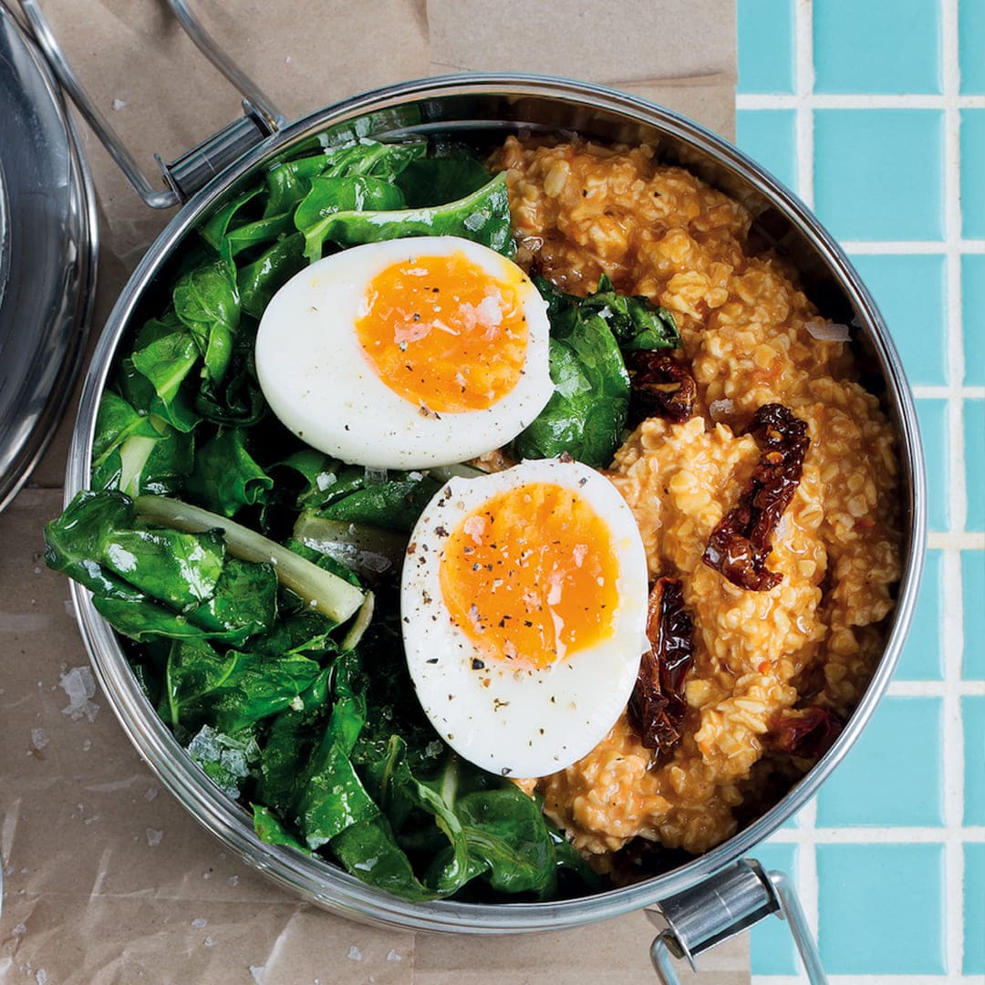 - Serve the savoury oats topped with some spicy morogo and a boiled egg.