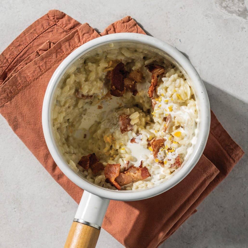 - For the risotto, place the bacon in a large cold pot. Heat the pot to a medium-low temperature to allow the bacon fat to render out and give flavour to the risotto.