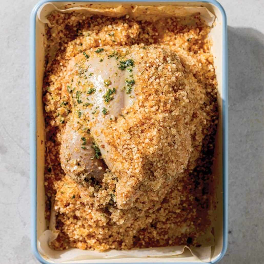 - Crack open the salt crust with a meat mallet and carefully break away the salt crust, gently brushing away any remaining salt on the chicken. Discard the crust.