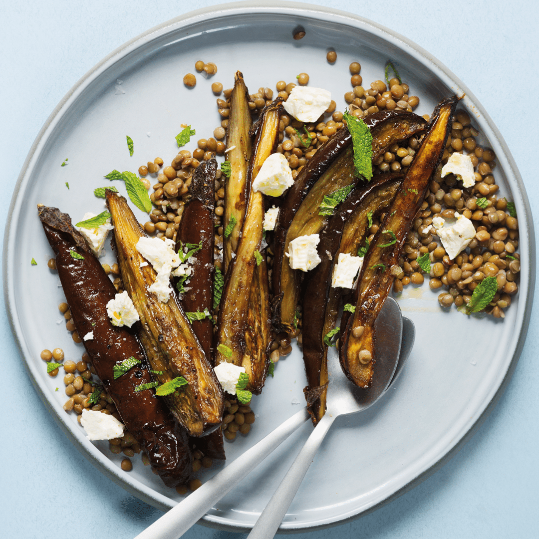- To serve, top the lentils with the brinjals, crumble the feta over and sprinkle with mint.