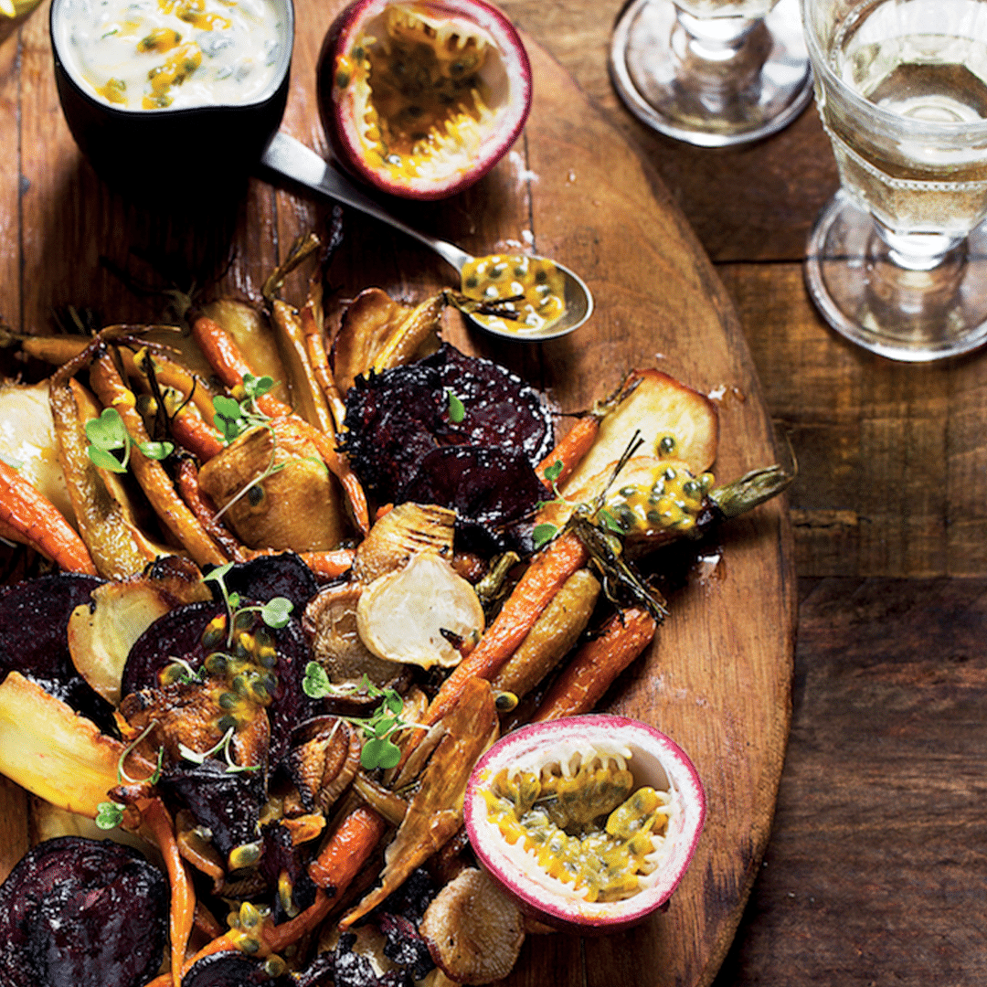 - To serve, arrange the roast vegetables on a platter with the granadilla tzatziki on the side.