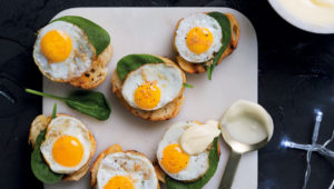 Mini eggs Benedict with bacon salt