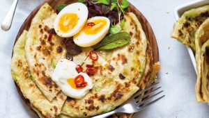Flaky spring onion pancakes with jammy eggs & chilli oil