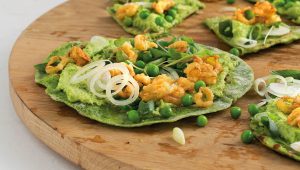 We like to call these home-made spinach wraps with fried leeks and pea hummus summer pizzas for their fresh green look and feel!