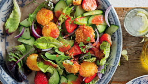 This strawberry salad with homemade goat's cheese croutons is the perfect summer side to share at your lunch party this weekend!