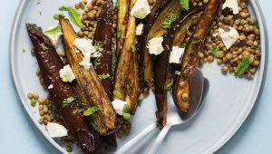 Roast brinjal, feta and lentil salad