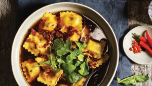 Not only is bone broth a healthy source of nutrients, but it adds delicious flavour to winter dishes like this ravioli in bone-broth sauce with bacon.