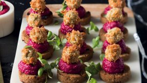 You don’t have to break the bank to make nutritious treats. These rye toast bites with fried olives and beetroot dip make perfect canapés.