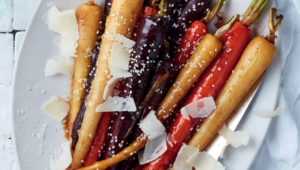 Looking for a healthy light snack? These yummy honeyed carrots with sesame and Parmesan are a delicious side dish!