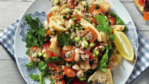 Fattoush is a Middle Eastern salad incorporating toasted or fried flatbread croutons. It’s a great way to repurpose day-old pita. Give it a try in this tuna and bean salad