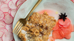 Skip your usual battered fish recipe and try this gut-friendly walnut crusted hake with apple cider fermented radishes.